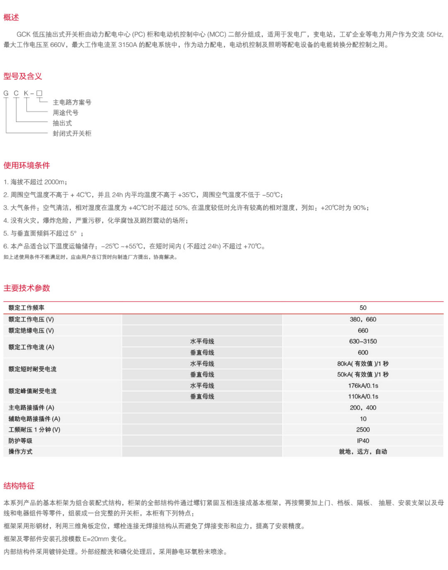 GCK低压抽出式开关柜由动力配电中心(PC)柜和电动机控制中心(MCC)二部分组成,适用于发电厂,变电站,工矿企业等电力用户作为交流50Hz,最大工作电压至660V,最大工作电流至3150A的配电系统中,作为动力配电,电动机控制及照明等配电设备的电能转换分配控制之用。